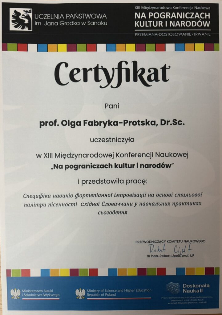 - Fabryka-Protska O., Gunder L. The specificity of multimedia technologies in the art of music in the context of distance learning in the context of distance learning: Realities and prospects. International conference Czech republic and lusophonic countries 2024: Education, art and digital technology in teaching. University of West Bohemia, Plzen, 2024. Czech Republic P.33-34. ISBN 978-80-261-1242-6 URL : https://dspace.zcu.cz/items/8b093539-579c-4a3f-a800-a139c27fd9b8 https://doi.org/10.24132/ZCU.2024.12426.33-34