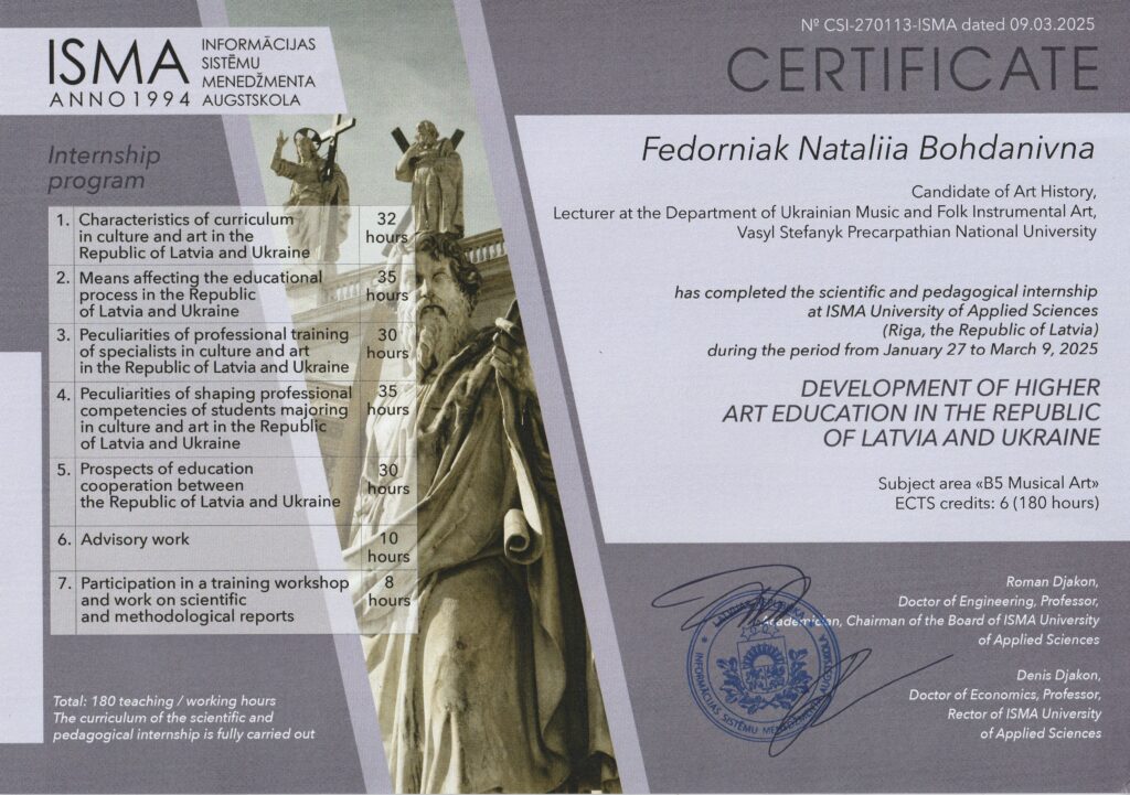 - Федорняк Н. Академічна бандура в системі фахової вищої мистецької освіти України. Proceedings of the scientific and pedagogical internship «Development of higher art education in the Republic of Latvia and Ukraine», January 27 – March 9, 2025. Riga, the Republic of Latvia: ISMA University of Applied Sciences, 2025. P. 104–108.